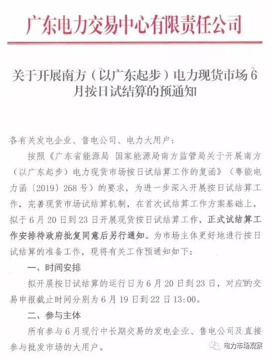 6月17日,廣東電力交易中心發(fā)布《關(guān)于開展南方(以廣東起步) 電力現(xiàn)貨市場(chǎng)6月按日試結(jié)算的預(yù)通知》。
