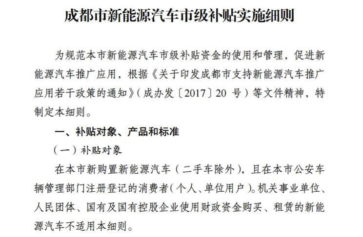 近日,成都市財(cái)政局發(fā)布了“關(guān)于印發(fā)《成都市新能源汽車市級(jí)補(bǔ)貼實(shí)施細(xì)則》的通知”(以下簡稱“通知”)。通知上顯示,在成都新購置新能源汽車(二手車除外),且在本市公安車輛管理部門注冊登記的消費(fèi)者(個(gè)人、單位用戶)在獲得中央財(cái)政補(bǔ)貼的基礎(chǔ)上將獲得額外的市級(jí)配套補(bǔ)貼,補(bǔ)貼額度為中央財(cái)政單車補(bǔ)貼額的50%。