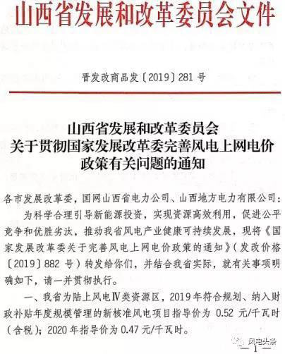 4、此前,山西省發(fā)改委已批復(fù)上網(wǎng)電價(jià)的風(fēng)電項(xiàng)目,2020年底前仍未并網(wǎng)的,國(guó)家不再補(bǔ)貼,上網(wǎng)電價(jià)按山西省燃煤機(jī)組標(biāo)桿電價(jià)執(zhí)行。