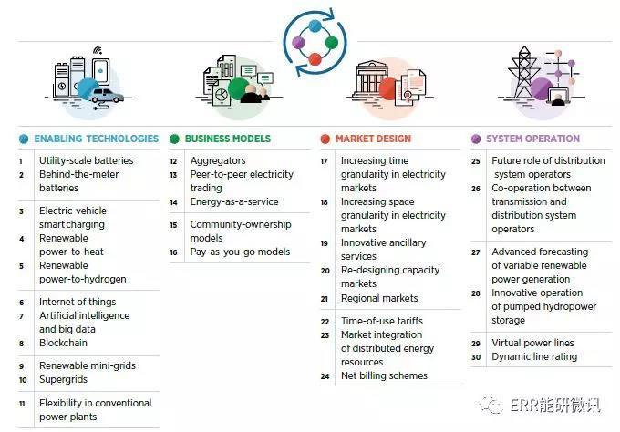 正如國際可再生能源署的工作所證實的,沒有一個單一能改變游戲規(guī)則的創(chuàng)新。任何孤立的創(chuàng)新都不可能產生重大影響,而是需要伴隨著電力所屬部門的創(chuàng)新。國際可再生能源署調查了大量創(chuàng)新的前景,這些創(chuàng)新可促進將高份額間歇性可再生能源融入到電力系統(tǒng)中,確定并集合了30項變革性創(chuàng)新,包括支持技術、業(yè)務模型、市場設計和系統(tǒng)操作。