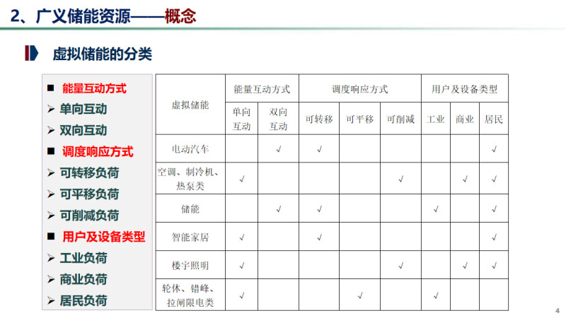 廣義儲(chǔ)能資源類型很多,可以從不同的分類,比如按照能量互動(dòng)方式可以分為單向互動(dòng)和雙向互動(dòng),按照調(diào)度響應(yīng)方式可以分為可轉(zhuǎn)移負(fù)荷、可平移負(fù)荷、可削減負(fù)荷,按照用戶及設(shè)備類型可以分為工業(yè)負(fù)荷、商業(yè)負(fù)荷、居民負(fù)荷。