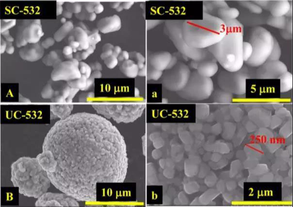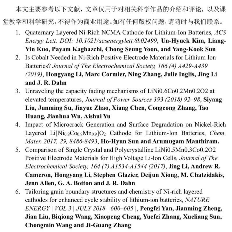 高鎳材料存在的這些問(wèn)題嚴(yán)重制約了高容量電芯產(chǎn)品的發(fā)展,而單晶材料的出現(xiàn)了為高容量正極材料的開(kāi)發(fā)打開(kāi)一個(gè)嶄新的方向,所謂單晶材料是相對(duì)于傳統(tǒng)的二次顆粒材料而言的,傳統(tǒng)的NCM材料多為200-300nm的一次顆粒團(tuán)聚而成的二次顆粒,而單晶材料則直接由直徑2-5um的獨(dú)立晶體構(gòu)成,由于更高結(jié)晶度、更加穩(wěn)定的層狀結(jié)構(gòu)、各向異性特征,單晶材料無(wú)論是在循環(huán)性能,還是在熱穩(wěn)定性,以及產(chǎn)氣量等指標(biāo)上都要優(yōu)于傳統(tǒng)的二次顆粒NCM材料[5]。