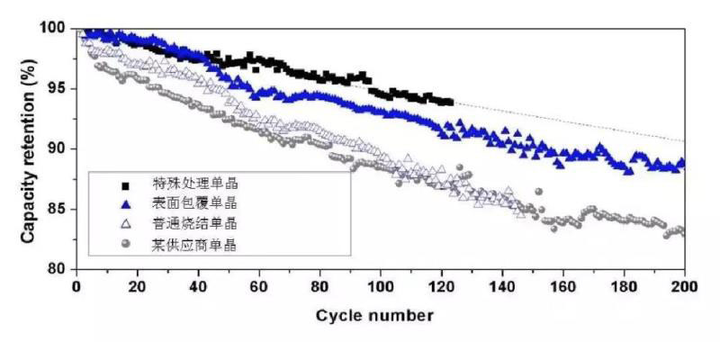 圖2 表面包覆處理顯著提升單晶材料循環(huán)穩(wěn)定性