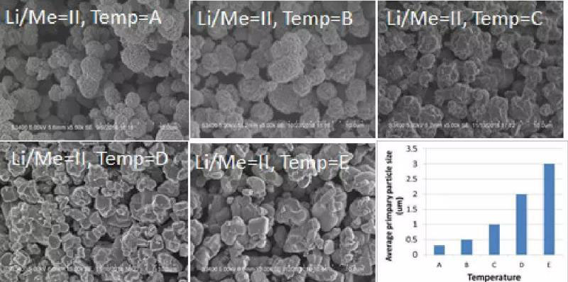 單晶材料制備的核心在于燒結(jié)工藝,其中溫度的控制是核心,溫度過(guò)低不利于晶體充分生長(zhǎng),過(guò)高則容易在材料內(nèi)部產(chǎn)生O缺陷,引起材料內(nèi)Li/Ni混排的增加,影響材料的性能。萬(wàn)向的科學(xué)家們?yōu)榱舜龠M(jìn)晶體的生長(zhǎng),同時(shí)減少材料過(guò)燒的風(fēng)險(xiǎn),通過(guò)優(yōu)化配鋰量和燒結(jié)溫度,制備出結(jié)晶形態(tài)良好的高鎳單晶三元材料。