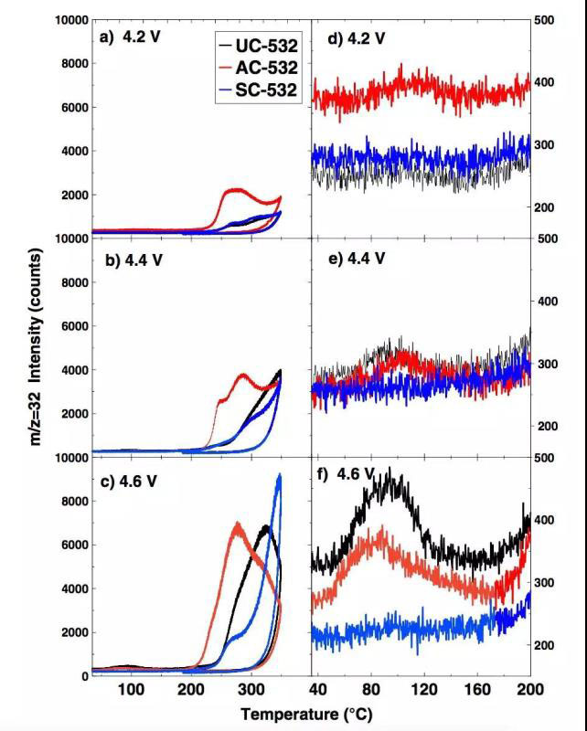 近期多起電動(dòng)汽車自燃事故,將電動(dòng)汽車的安全性問(wèn)題推上了風(fēng)口浪尖,前面我們已經(jīng)介紹過(guò)隨著Ni含量的提高會(huì)導(dǎo)致材料的熱穩(wěn)定性下降,而單晶材料由于晶體結(jié)構(gòu)更加穩(wěn)定,因此熱穩(wěn)定性也會(huì)相應(yīng)提高,O2釋放量實(shí)驗(yàn)表明單晶NCM523材料不但在80℃附近沒(méi)有O2釋放,而且在200-350℃范圍內(nèi)的O2釋放峰的溫度也要高于二次顆粒NCM523材料[5],這也表明單晶材料在熱穩(wěn)定上具有一定的優(yōu)勢(shì)。