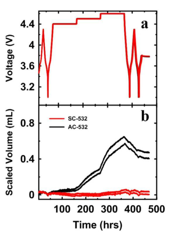 近年來(lái),隨著動(dòng)力電池能量密度的持續(xù)提升,能量密度更高的軟包電池的市場(chǎng)份額也在逐年擴(kuò)大,相比于硬殼電池,軟包電池對(duì)于材料產(chǎn)氣更加敏感,因此產(chǎn)氣量也是衡量材料穩(wěn)定性的重要指標(biāo)之一。通過(guò)浮充實(shí)驗(yàn)?zāi)軌虬l(fā)現(xiàn),單晶材料產(chǎn)氣量非常小[5],在4.4V、4.5V和4.6V電壓下浮充100h的產(chǎn)氣量?jī)H為0.01、0.01和0.04ml,而同樣條件下Al2O3包覆的二次顆粒NCM523材料電池的產(chǎn)氣量則分別達(dá)到了0.07、0.27和0.62ml,這再次表明單晶材料在產(chǎn)氣上具有較大的優(yōu)勢(shì)。