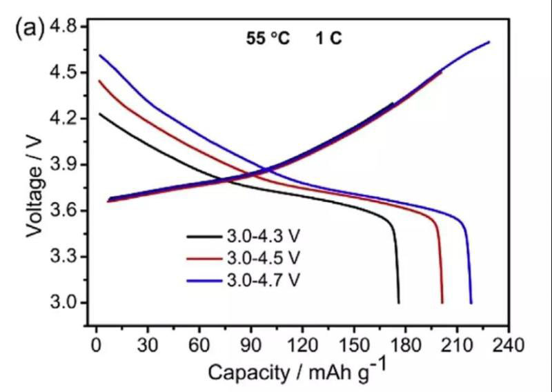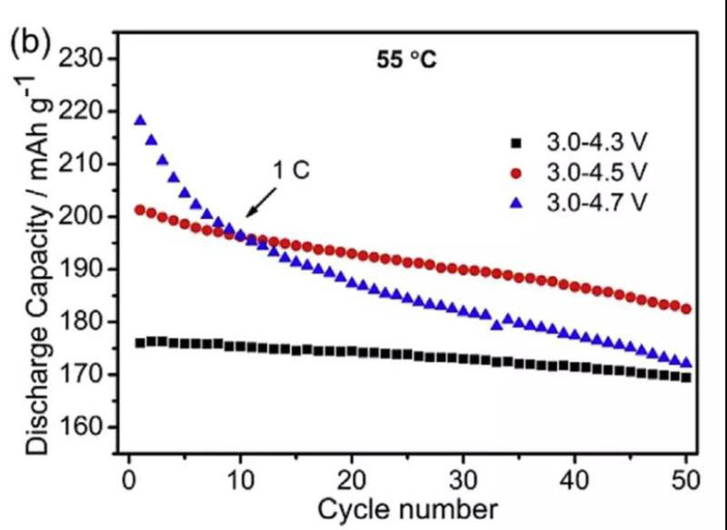 但是上述措施在提升正極材料容量的同時(shí)也會(huì)導(dǎo)致正極材料的循環(huán)性能和安全性能顯著的降低,以NCM622材料為例,雖然4.7V截止電壓可以為NCM622材料帶來(lái)接近220mAh/g的比容量,但是同時(shí)會(huì)導(dǎo)致材料的循環(huán)壽命嚴(yán)重退化。在55℃,半電池體系4.7V截止電壓下循環(huán)50次后,NCM622材料的容量保持率僅為78.9%,遠(yuǎn)低于4.3V下循環(huán)的NCM622材料(96.3%)[3],高電壓下的高鎳材料循環(huán)穩(wěn)定性面臨嚴(yán)峻的挑戰(zhàn)。