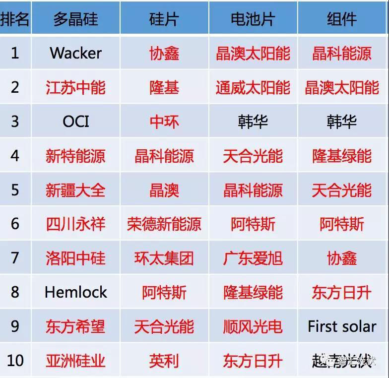 巨大的產(chǎn)量,成就了許多國(guó)內(nèi)企業(yè)。2018年,全球各個(gè)環(huán)節(jié)前10名的企業(yè)如下表所示。