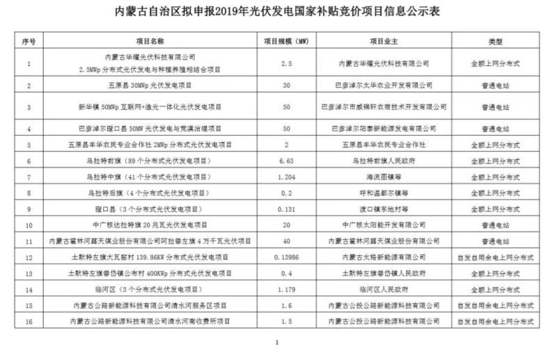 內(nèi)蒙古自治區(qū)能源局關(guān)于擬申報2019年光伏發(fā)電國家補(bǔ)貼競價項(xiàng)目的公示