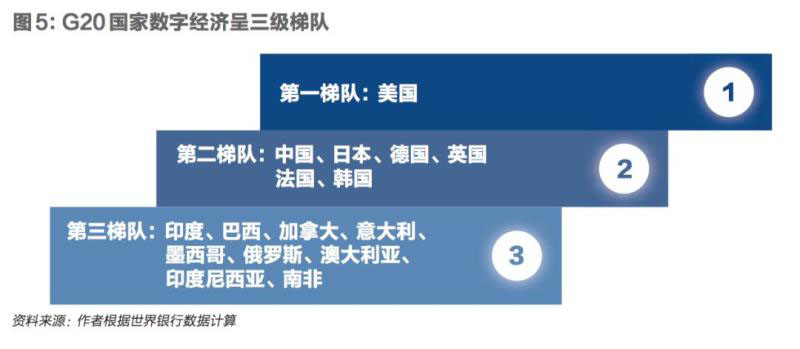 按照各國數(shù)字經(jīng)濟(jì)測算規(guī)模作為劃分標(biāo)準(zhǔn),G20國家數(shù)字經(jīng)濟(jì)發(fā)展與各國經(jīng)濟(jì)實(shí)際情況高度相關(guān),呈現(xiàn)清晰的三級梯隊。美國作為全球最大經(jīng)濟(jì)體,數(shù)字經(jīng)濟(jì)總量及各行業(yè)發(fā)展水平都處于全球前列,實(shí)力遙遙領(lǐng)先于第二梯隊。中國、日本、德國、英國、法國、韓國積極布局?jǐn)?shù)字經(jīng)濟(jì)關(guān)鍵領(lǐng)域,發(fā)展跟隨其后,數(shù)字經(jīng)濟(jì)規(guī)模介于5000億美元至3.5萬億美元之間。印度、巴西、加拿大、意大利、墨西哥、俄羅斯、澳大利亞、印度尼西亞與南非處于數(shù)字經(jīng)濟(jì)發(fā)展第三梯隊,數(shù)字經(jīng)濟(jì)規(guī)模均位于5000億美元以下。