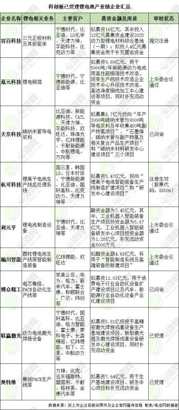 截至目前,在141家在科創(chuàng)板上市申請(qǐng)獲得受理的企業(yè)中,共計(jì)9家企業(yè)主營業(yè)務(wù)涉及鋰電領(lǐng)域,其中5家已成功過會(huì)。具體來看,3家為材料企業(yè):容百科技(三元正極材料及其前驅(qū)體)、嘉元科技(鋰電銅箔)、天奈科技(碳納米管導(dǎo)電漿料);6家為鋰電設(shè)備企業(yè):杭可科技(鋰離子電池生產(chǎn)線后處理系統(tǒng))、利元亨(鋰電制造設(shè)備)、瀚川智能(圓柱鋰電池生產(chǎn)線等智能制造裝備)、博眾精工(電芯模組、PACK自動(dòng)化生產(chǎn)線)、聯(lián)贏激光(動(dòng)力電池激光焊接設(shè)備)、奧特維(鋰電模組PACK線裝備)。以上9家企業(yè)擬在科創(chuàng)板融資總計(jì)76.47億元。