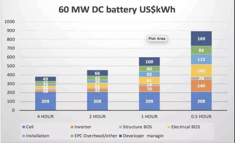 下圖的數(shù)據(jù)源自NREL 2018年的一篇文章,該組數(shù)據(jù)所要顯示地是在不同使用時(shí)長(zhǎng)下,60MW公用事業(yè)規(guī)模儲(chǔ)能電池成本組成情況。60MW電池的使用時(shí)長(zhǎng)可以達(dá)到30分鐘(30MWh)至4小時(shí)(240MWh)。