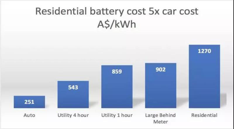 基于每千瓦時(shí)的安裝成本(美元),家用電池的安裝成本約為電動(dòng)汽車所用電池的5倍。除了電池本身的費(fèi)用,家用電池比動(dòng)力電池多出來(lái)的費(fèi)用,主要來(lái)源于除電芯外,儲(chǔ)能電池系統(tǒng)中其他部件的成本費(fèi)用。