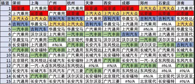 乘用車企業(yè)數(shù)量眾多,各城市主力企業(yè)參與并非很強。。在上海市場上汽通用表現(xiàn)相對較強,柳州市上汽通五菱表現(xiàn)相對較強,合肥市場江淮表現(xiàn)相對較強,杭州市的比亞迪表現(xiàn)優(yōu)秀,南昌市場的江鈴汽車表現(xiàn)優(yōu)秀,保定市場的長城汽車表現(xiàn)相對優(yōu)秀,深圳市場的比亞迪表現(xiàn)相對優(yōu)秀,。