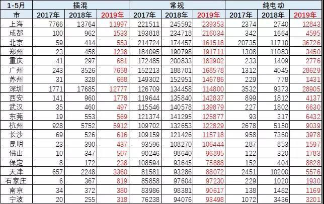 2019年1-5月的上海、成都、鄭州、重慶、廣州、蘇州、深圳等地方的乘用車表現(xiàn)較好。部分城市19年1-5月銷量超越18年全年。