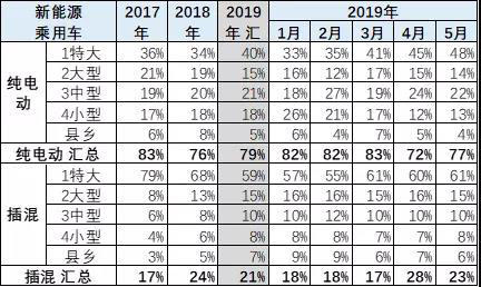 在大型非限購城市,目前看純電動車的需求總體相對疲軟,占比達到兩個百分點,較2018年的三個百分點稍有下降,而在中型城市,新能源車的占比總體稍有回升,其中主要的貢獻是純電動車的銷量增長,插電混動也有一定貢獻,