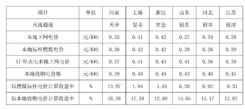 根據(jù)國(guó)家能源局關(guān)于2017年度全國(guó)電力價(jià)格情況監(jiān)管通報(bào),國(guó)網(wǎng)2017年電力市場(chǎng)交易信息報(bào)告,選取河南省,江蘇省、浙江、山東、上海、河北等省進(jìn)行分析,輸送電量分為水電、火電、新能源和火電打捆。根據(jù)落地省落地電價(jià)分別與落地省燃煤標(biāo)桿電價(jià)、本省電網(wǎng)電力平均收購電價(jià)計(jì)算收益率見下表1。