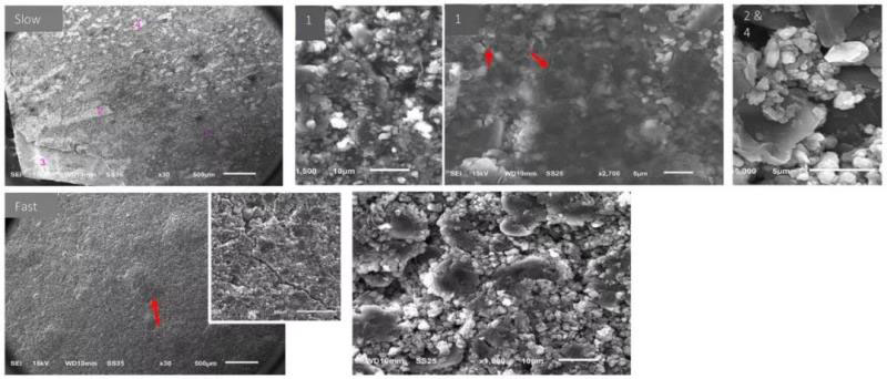 從形貌上看,慢速化成電池負極表面有很多雜斑,部分區(qū)域表面有覆蓋層(如如中紅色箭頭所示),部分區(qū)域呈裸露狀態(tài)(作者猜測是拆解時撕下的隔膜)。快速化成電池負極表面可以明顯觀察到氣泡,并且局部可以觀察到裂紋。