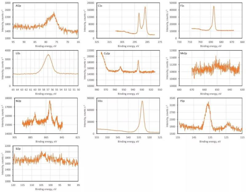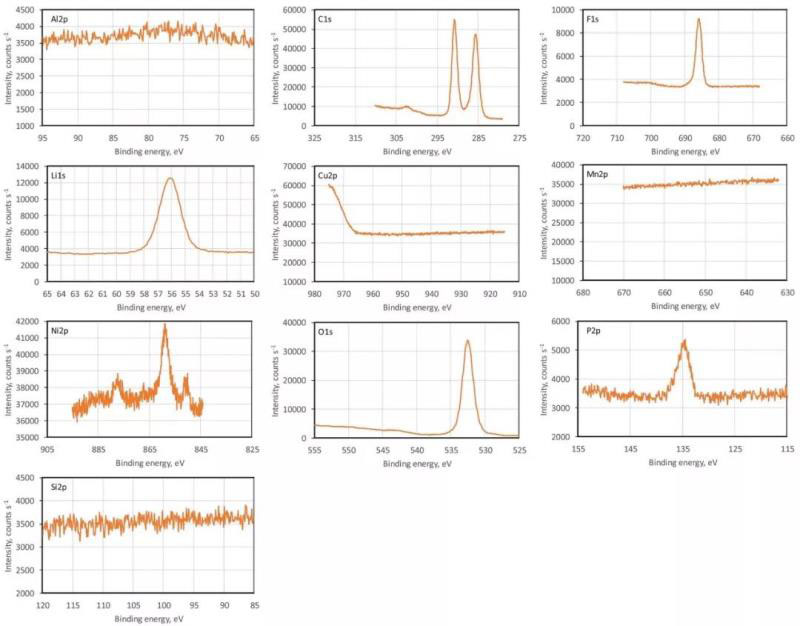 從負極XPS分析結(jié)果看,無論是慢速化成還是快速化成,C都處于兩種不同環(huán)境狀態(tài),其一為C-C和C-H (~285 eV),其一為C-F或Li2CO3 (~289–290 eV),并且都能檢測到Ni元素存在。慢速化成電池負極含有更多的LiF和含磷化合物,表明慢速化成有更多的LiPF6發(fā)生了分解。值得注意的是,慢速化成電池負極能檢測到相當量的Al和Cu,作者認為這主要是慢速化成時間太長Al箔和Cu箔溶出在負極沉積所致。此外,慢速化成能檢測到Si而快速化成則檢測不到,作者認為這是快速化成電池負極SEI太厚超過XPS信號檢測范圍所致。