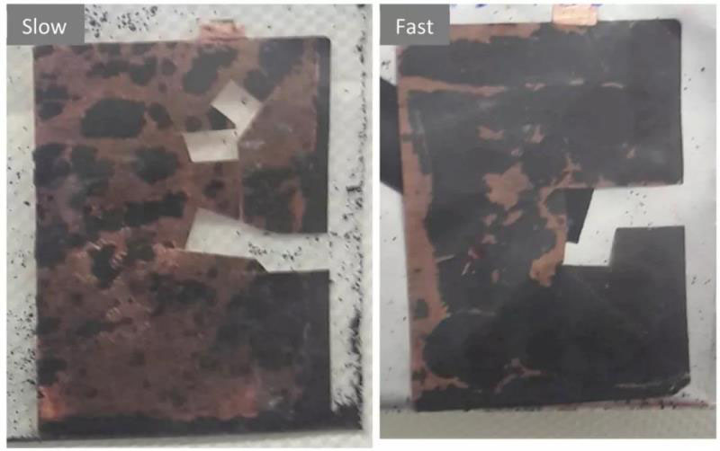 圖4. 慢速化成和快速化成電池拆解后負極極片對比。