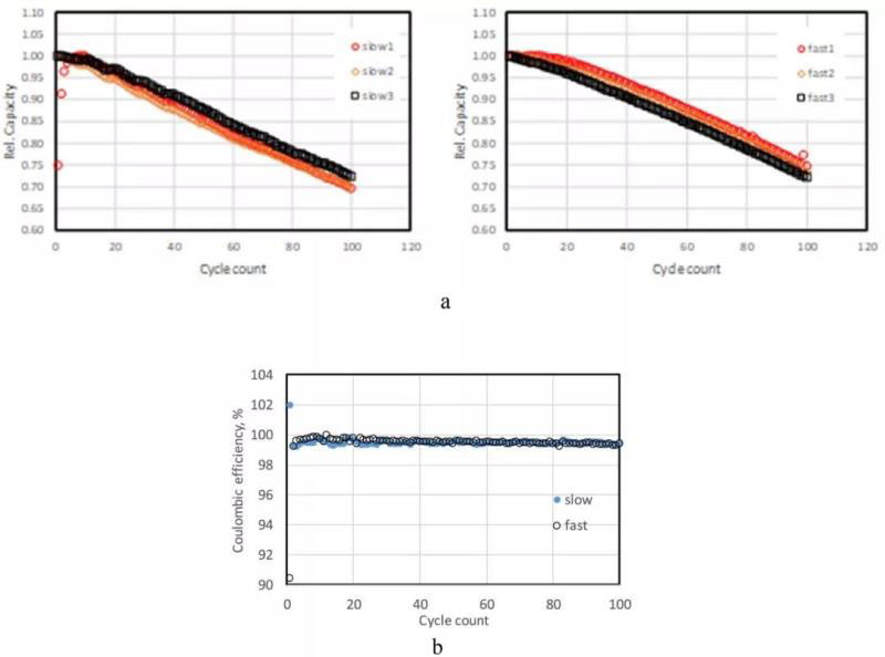 圖3. (a)慢速化成(左圖)和快速化成(右圖)電池循環(huán)容量保持率;(b)慢速化成和快速化成電池循環(huán)庫倫效率對比。