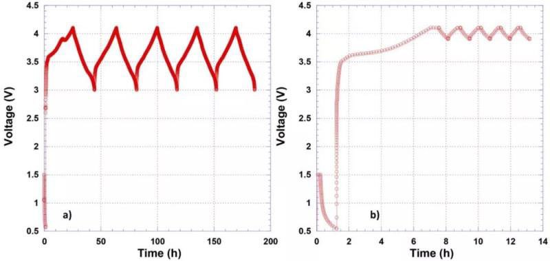 圖2. 慢速化成(左圖)和快速化成(右圖)電壓-時間曲線。