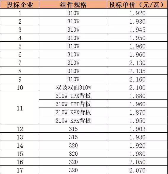 從報價來看,310W組件最低報價1.87元/瓦,最高報價2.16元/瓦,平均價1.989元/瓦,主要報價集中在1.92-1.96元/瓦,其中某一家企業(yè)針對不同的背板類型分別報出了不同的價格,其他家使用何種背板未作明確說明。另外,315W組件只有兩家企業(yè)投標(biāo),報價相對比較一致,均低于目前市場價;320W組件共4家企業(yè)投標(biāo),報價差異較大,最低1.92元/瓦,最高2.07元/瓦。