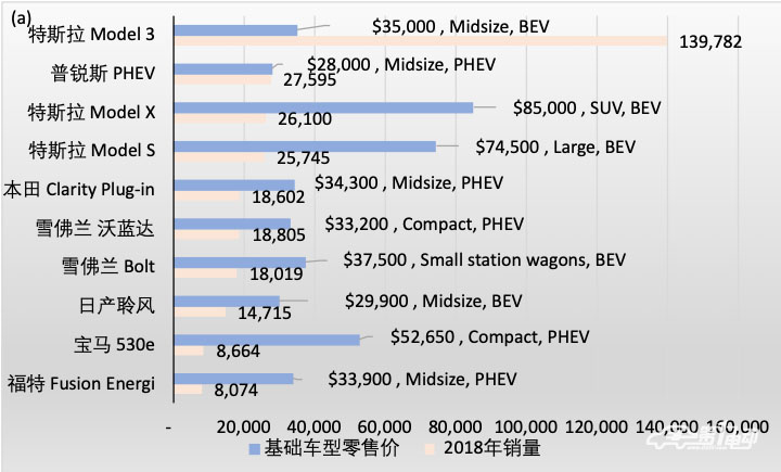 圖4:中美市場銷量前十名的車型售價與銷量(a)美國,(b)中國