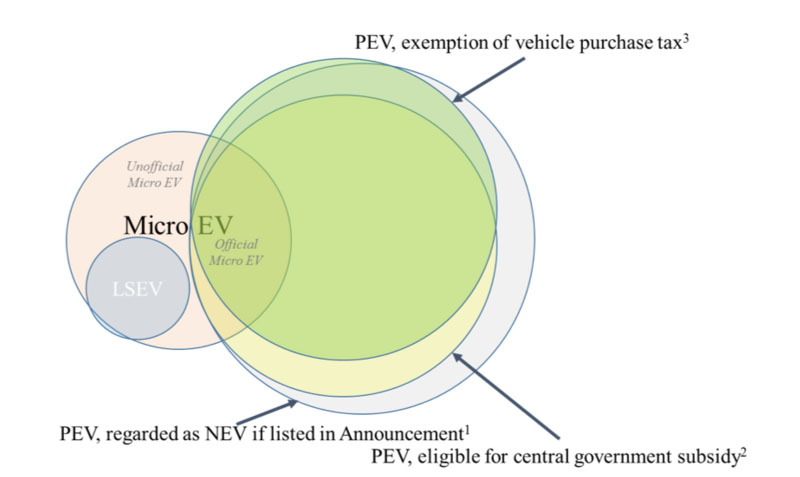 研究特別說明了與補(bǔ)貼相關(guān)的新能源汽車劃定范圍。官方認(rèn)定的新能源汽車指的是被列入《道路機(jī)動車輛生產(chǎn)企業(yè)及產(chǎn)品公告》中的車型,但官方認(rèn)定并不保證獲得政府補(bǔ)貼。被列入《新能源汽車推廣應(yīng)用推薦車型目錄》的車型才是政府補(bǔ)貼的目錄。目錄中一些車型被列入《免征車輛購置稅的新能源汽車車型目錄》,即可免征車輛購置稅。圖1列出了各項政策覆蓋車型之間的關(guān)系。