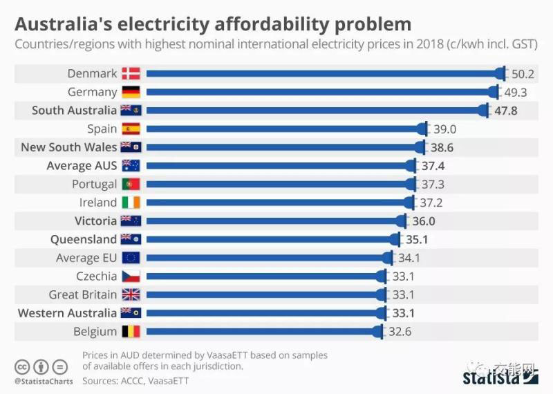 2018年澳大利亞平均民用電價(jià)達(dá)到0.37澳元每千瓦時(shí),約合0.23歐元每千瓦時(shí)。將澳大利亞電價(jià)與歐洲國(guó)家比較發(fā)現(xiàn),南澳大利亞州的電價(jià)處于世界最高電價(jià)行列之中,只次于德國(guó)和丹麥。而在2004年時(shí)澳大利亞還是經(jīng)合組織中電價(jià)第四便宜的國(guó)家。