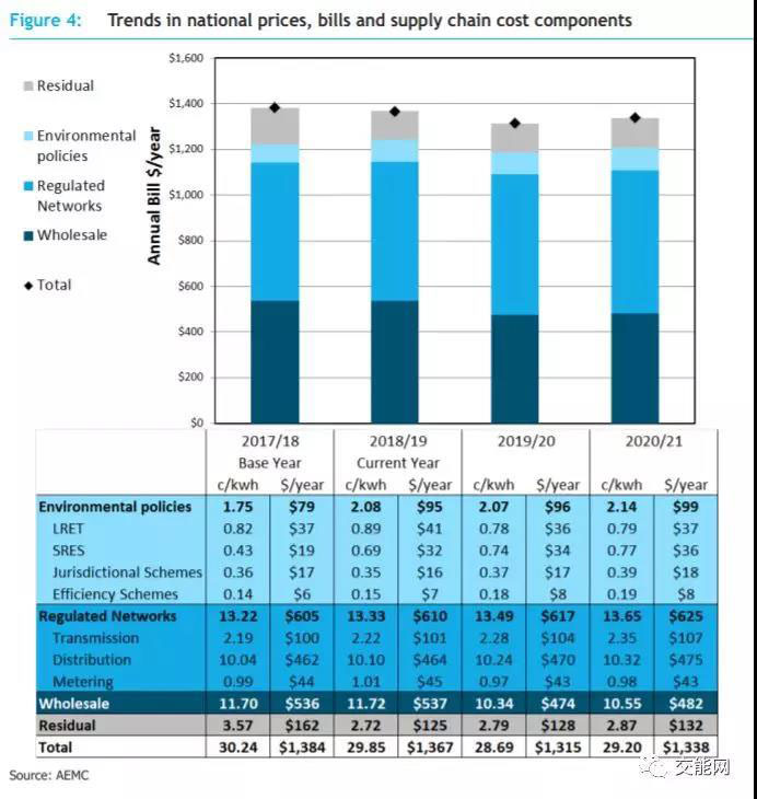 上圖展示了10年中澳大利亞民用電價(jià)上漲中,各電價(jià)組成要素的漲幅百分比,由圖可見: