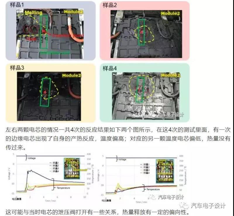 這顆電芯和相關(guān)的實(shí)驗(yàn),之前《熱失控測試-整包的測試》中有關(guān)的測試結(jié)果,僅僅一般的內(nèi)短路不至于把這車弄成這個樣子,調(diào)查起來也比較困難,早期的國外純電動汽車電池系統(tǒng)設(shè)計其實(shí)偏保守的,不是單個問題(針刺、過充)就引發(fā)整個電池系統(tǒng)的熱失控。