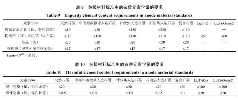 歐盟的RoHS標(biāo)準即《電子和電器設(shè)備中限用某些物質(zhì)的指令》中對各類有害物質(zhì)做出了限定,我國制定的標(biāo)準也參考了這一規(guī)定。例如,部分負極原料中含有鎘、鉛、汞、六價鉻及其化合物等限用元素,它們對動物、植物和環(huán)境有害,因此在標(biāo)準中對此類物質(zhì)有嚴格的限制(石墨≤20ppm,鈦酸鋰≤100ppm,1ppm=10-6)(表10)。另外,負極材料的生產(chǎn)設(shè)備大都為不銹鋼和鍍鋅鋼板等,產(chǎn)品中往往都含有鐵、鉻、鎳和鋅等磁性雜質(zhì),它們可以通過磁選的方式被收集,因此標(biāo)準中對此類雜質(zhì)的含量要求較嚴格(石墨≤1.5 ppm,鈦酸鋰≤20 ppm)。