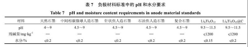 負極材料的pH和水分對材料的穩(wěn)定性和制漿工藝有重要影響。對于石墨而言,其pH通常在中性左右(4~9),而Li4Ti5O12則呈堿性(9.5~11.5),具有一定的殘堿度(表7)。這主要是因為在制備Li4Ti5O12時,為保證反應(yīng)的充分進行,一般都會讓鋰源過量,而它們主要以Li2CO3或者LiOH的形式存在,使最終產(chǎn)品呈堿性。當(dāng)殘堿量過高時,材料的穩(wěn)定性變差,容易與空氣中的水和二氧化碳等反應(yīng),會直接影響材料的電化學(xué)性能。另外,由于石墨類負極漿料目前主要為水性體系,因此它對水分的要求(≤0.2%)并沒有像正極材料(漿料通常為油性體系,≤0.05%)那樣苛刻,這對降低電池的生產(chǎn)成本和簡化工藝具有一定意義。