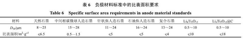 負極材料的比表面積對電池的動力學(xué)性能和固體電解質(zhì)膜(SEI)的形成有很大影響。例如,納米材料一般具有較高比表面積,能夠縮短鋰離子的傳輸路徑、減小面電流密度、提升電池的動力學(xué)性能,因而得到了廣泛的研究。但往往這類材料卻無法得到實際應(yīng)用,主要是因為大比表面積會加劇電池在 首次循環(huán)時電解液的分解,造成較低的首次庫侖效率。因此,負極材料標(biāo)準對石墨和鈦酸鋰的比表面積設(shè)定了上限值,例如石墨的比表面積需要被控制在6.5m2/g以下,而Li4Ti5O12@C也要小于18m2 /g(表6)。