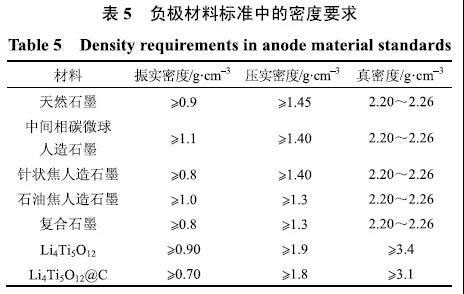 負極材料的密度會直接影響到電池的體積能量密度。對于同一種材料,其壓實密度越大,體積能量密度也越高,因此標(biāo)準中對各項密度的下限值均做出了要求(表5)。其中,不同石墨材料的真密度范圍相同,均為 2.20~2.26g/cm3 ,這是因為它們從本質(zhì)上講都是碳材料,只是微結(jié)構(gòu)不同而已。另外, 由于Li4Ti5O12的初始電導(dǎo)率較低,通常需要通過碳包覆來提升電池的倍率性能,但與此同時,相應(yīng)的振實密度有所下降(表5)。