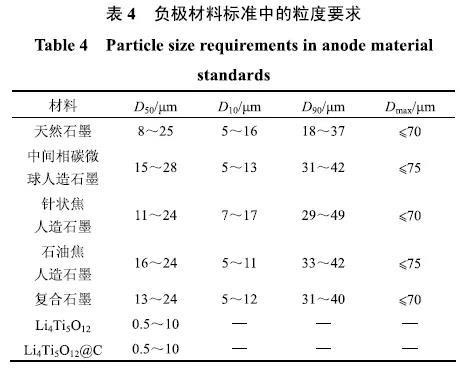 負極材料的粒度主要是由其制備方法決定的。例如,中間相碳微球(CMB)的合成方法為液相烴類在高溫高壓下的熱分解和熱縮聚反應(yīng),可通過控制原料的種類、反應(yīng)時間、溫度和壓力等來調(diào)控CMB的粒徑。石墨標(biāo)準中對其粒徑參數(shù)的要求分別為:D50(約20μm)、Dmax(≤70μm)和D10(約10μm),而鈦酸鋰標(biāo)準中要求的D50明顯小于石墨 (≤10μm,表4)。