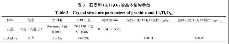 Li4Ti5O12通常是以TiO2和Li2CO3為原料經(jīng)高溫?zé)Y(jié)制備的,因此產(chǎn)品中有可能會殘留少量的TiO2,影響了材料的電化學(xué)性能。為此,GB/T30836—2014《鋰離子電池用鈦酸鋰及其碳復(fù)合負極材料》中給出了 Li4Ti5O12產(chǎn)品中TiO2殘留量的上限值及檢測方法。具體過程為:首先,通過XRD測得樣品的衍射圖譜,應(yīng)符合JCPDS(49-0207)的規(guī)定;其次,從譜圖中讀出Li4Ti5O12的(111)晶面衍射峰、銳鈦礦型TiO2(101)晶面衍射峰、金紅石型 TiO2(110)晶面衍射峰的強度;最后計算銳鈦礦型TiO2峰強比I101/I111和金紅石型TiO2峰強比 I110/I111,對照標(biāo)準中的要求即可做出判斷(表3)。