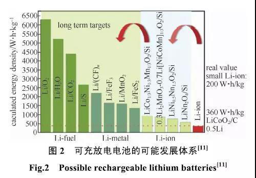 直到1989年,Sony公司研究發(fā)現(xiàn)可以用石油焦替代金屬鋰,才真正的將鋰離子電池推向了商業(yè)化。在此后的發(fā)展過程中,石墨因其較低且平穩(wěn)的嵌鋰電位(0.01~0.2 V)、較高的理論比容量(372 mA·h/g)、廉價和環(huán)境友好等綜合優(yōu)勢占據(jù)了鋰離子電池負極材料的主要市場。此外,鈦酸鋰(Li4Ti5O12)雖然容量較低(175 mA·h/g),且嵌鋰電位較高(1.55V),但是它在充放電過程中結(jié)構(gòu)穩(wěn)定,是一種“零應(yīng)變材料”, 因此在動力電池和大規(guī)模儲能中有一定的應(yīng)用,占據(jù)著少量的市場份額。隨著人們對鋰離子電池能量密度的追求越來越高,硅材料和金屬鋰將是負極材料未來的發(fā)展趨勢(圖2)。