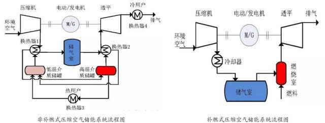 壓縮空氣儲(chǔ)能具有儲(chǔ)能密度大、存儲(chǔ)周期長(zhǎng)、投資成本較少等優(yōu)點(diǎn)。按照運(yùn)行方式的不同,壓縮空氣儲(chǔ)能系統(tǒng)可以分為補(bǔ)燃式和非補(bǔ)燃式兩大類(如圖)。
