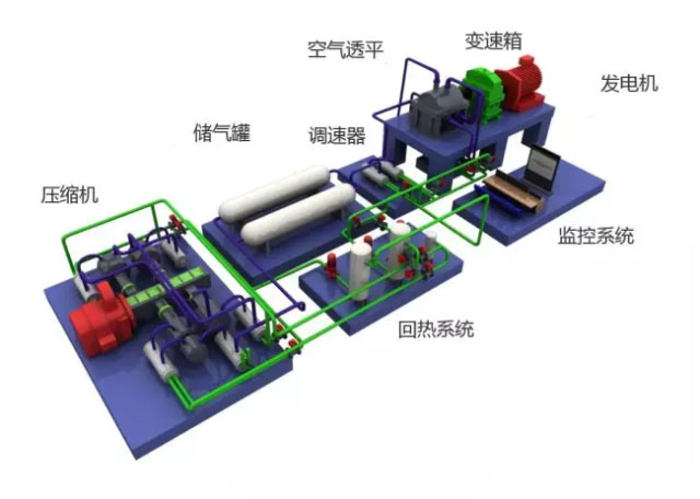 簡(jiǎn)單來說,就是將低谷電、棄風(fēng)電、棄光電等不易儲(chǔ)藏的電力儲(chǔ)存在壓縮空氣中,將其轉(zhuǎn)化為空氣分子的內(nèi)勢(shì)能。當(dāng)用電高峰到來之時(shí),再把高壓空氣的分子勢(shì)能釋放出來做功發(fā)電,從而改善發(fā)電與用電的時(shí)空結(jié)構(gòu)。