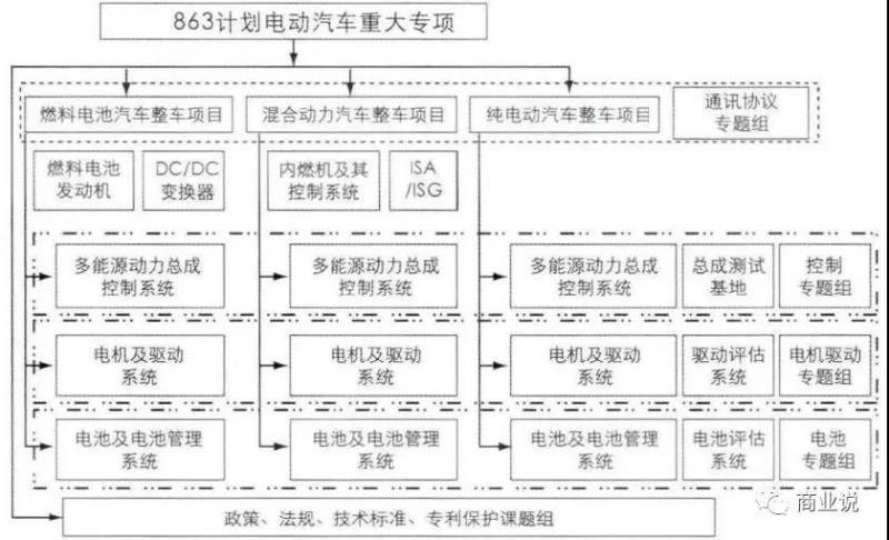 三縱是指插電式混合動(dòng)力汽車(chē)、純電動(dòng)汽車(chē)、燃料電池汽車(chē);三橫是指多能源動(dòng)力總成控制系統(tǒng)、電機(jī)及其控制系統(tǒng)和電池及其管理系統(tǒng)。“三縱”是不同階段的產(chǎn)業(yè)化目標(biāo),“三橫”則是實(shí)現(xiàn)不同階段產(chǎn)業(yè)化目標(biāo)的技術(shù)基礎(chǔ)。