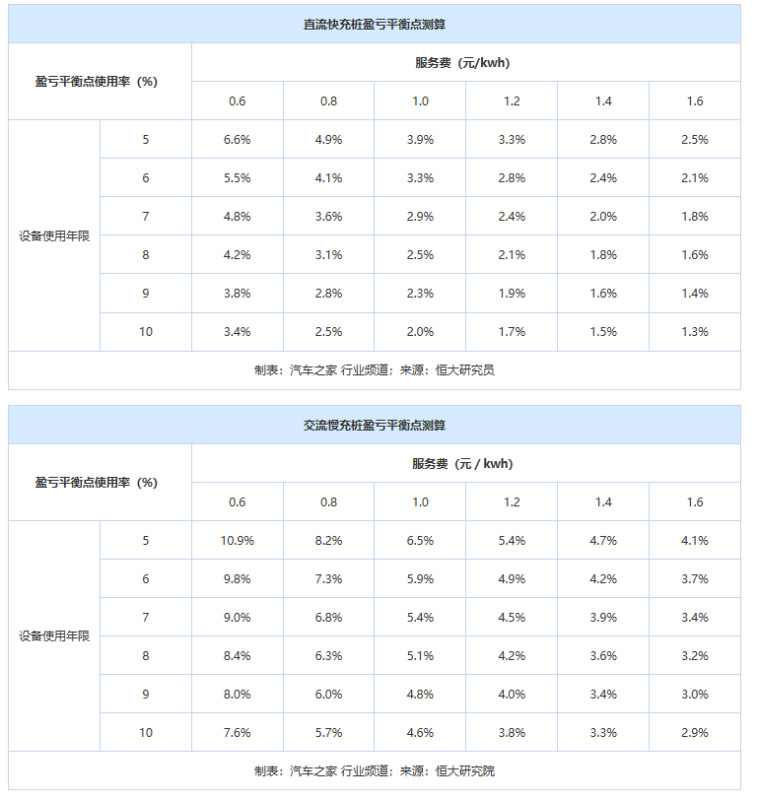 那么到怎樣的使用頻次,公共樁可以賺錢呢?恒大研究院針對(duì)直流快充樁和交流慢充樁,分別做了如下表所示的模型測(cè)算: