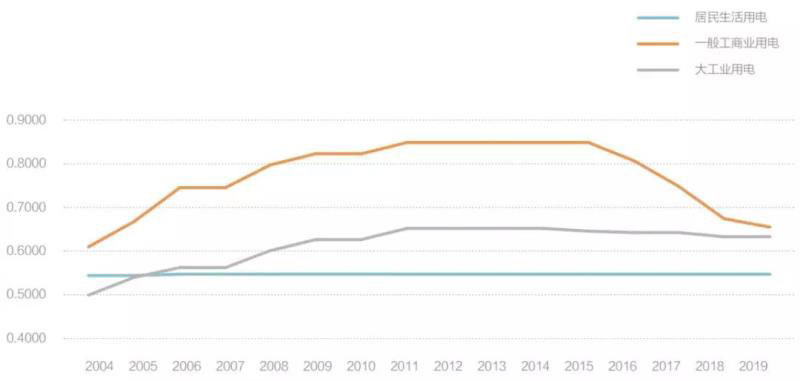 即使需要補(bǔ)貼居民電價(jià)和農(nóng)業(yè)電價(jià)帶來的電費(fèi)缺口,2018年和2019年中國還是連續(xù)兩年每年降低了10%的工商業(yè)電價(jià),給用電企業(yè)減負(fù)。瞅瞅這電價(jià)曲線圖,一目了然——
