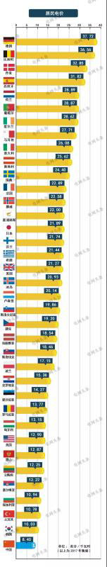 中國的電價(jià)到底高不高?前一段時(shí)間,網(wǎng)上吵翻了(此處省略1萬字……)。為了讓大家更直觀地了解,中國的電價(jià)在世界上到底是啥水平,頭條君收集了2017年世界上37個(gè)國家居民和工業(yè)電價(jià)的最新數(shù)據(jù)。咱來實(shí)打?qū)嵉乇缺瓤础?