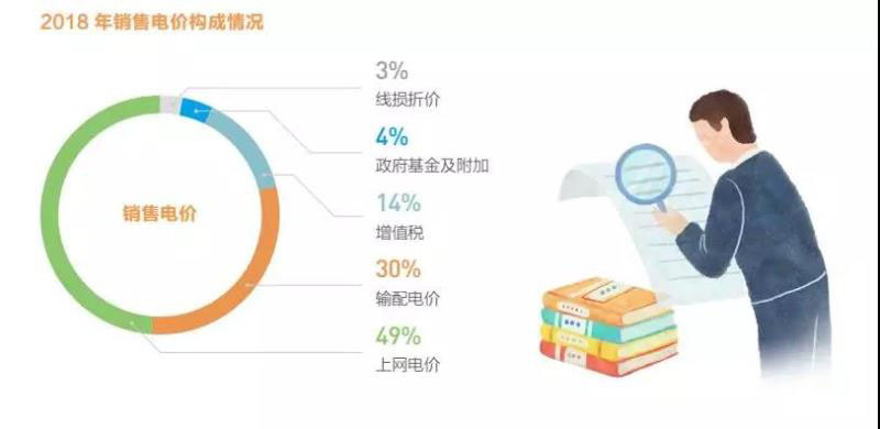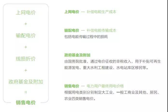 我們交電費(fèi)時(shí)的電價(jià)叫做“銷售電價(jià)”。它由上網(wǎng)電價(jià)、輸配電價(jià)、線損折價(jià)、政府基金及附加4部分組成。