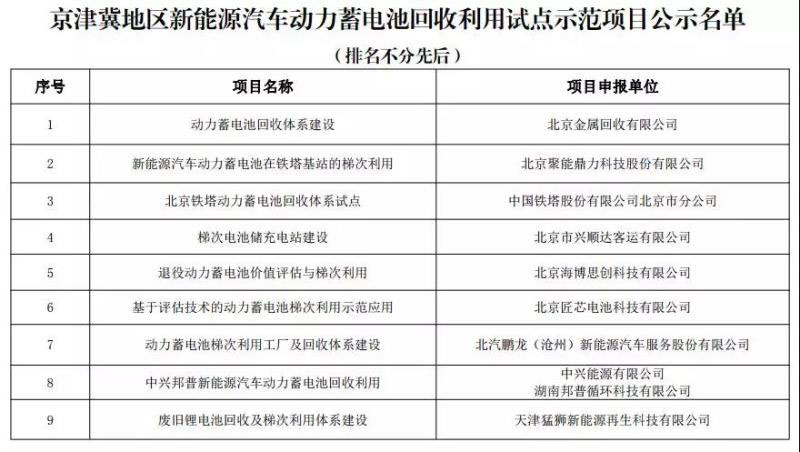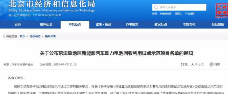 7月8日,北京經(jīng)信局發(fā)布關(guān)于公布京津冀地區(qū)新能源汽車動(dòng)力電池回收利用試點(diǎn)示范項(xiàng)目名單的通知。