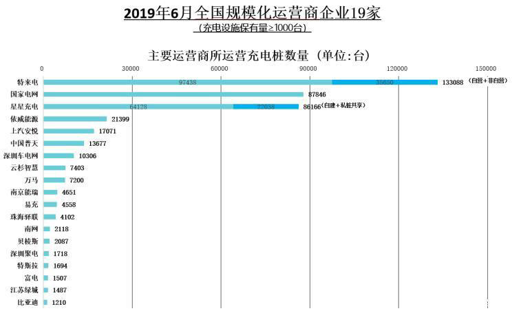 與上月相似,從運(yùn)營商角度來看,集中度也較高。截止到2019年6月,全國充電運(yùn)營企業(yè)所運(yùn)營充電樁數(shù)量超過1萬臺的共有7家,分別為:特來電運(yùn)營13.3萬臺、國網(wǎng)運(yùn)營8.8萬臺、星星充電運(yùn)營8.6萬臺、依威能源運(yùn)營2.1萬臺、上汽安悅運(yùn)營1.7萬臺、中國普天運(yùn)營1.4萬臺、深圳車電網(wǎng)運(yùn)營1.0萬臺。這7家運(yùn)營商占總量的89.8%,其余的運(yùn)營商占總量的10.2%。