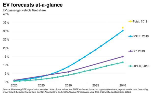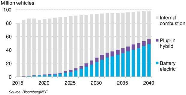 ▲彭博新能源財(cái)經(jīng)(BloombergNEF)的研究顯示,到2040年,大約57%的汽車將由電池驅(qū)動(dòng)