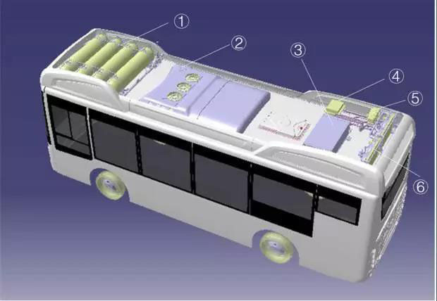 燃料電池汽車的碰撞安全主要包括儲(chǔ)氫系統(tǒng)、氫氣管路、燃料電池堆、各類閥門、連接頭等關(guān)鍵部件在發(fā)生碰撞時(shí)不能遭受破壞。目前,對(duì)燃料電池氫安全的碰撞防護(hù)設(shè)計(jì)除了關(guān)鍵零部件具有防撞能力外,主要通過(guò)位置布置、固定裝置保護(hù)和慣性開關(guān)監(jiān)控碰撞并與整車監(jiān)控系統(tǒng)聯(lián)動(dòng),自動(dòng)斷電、自動(dòng)關(guān)閉閥門等措施來(lái)避免災(zāi)難的發(fā)生。例如,燃料電池混合動(dòng)力客車的高壓儲(chǔ)氫瓶一般放在車輛前置頂部,燃料電池模塊放在客車后置頂部,動(dòng)力電池放置于地板下方。前置的儲(chǔ)氫瓶,通過(guò)車頂部的管路與車輛后部的燃料電池系統(tǒng)連接,在發(fā)生泄露時(shí),氫氣可以迅速排放到大氣中去。燃料電池模塊對(duì)車身結(jié)構(gòu)基本無(wú)影響,而動(dòng)力電池放置在地板下方,則兼顧了車身重心低穩(wěn)定性好,如圖2-2所示。